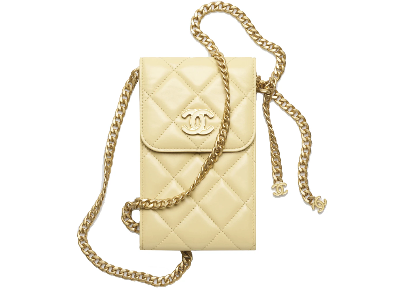 Chanel Phone Holder With Chain Light Yellow In Lambskin Leather Gb